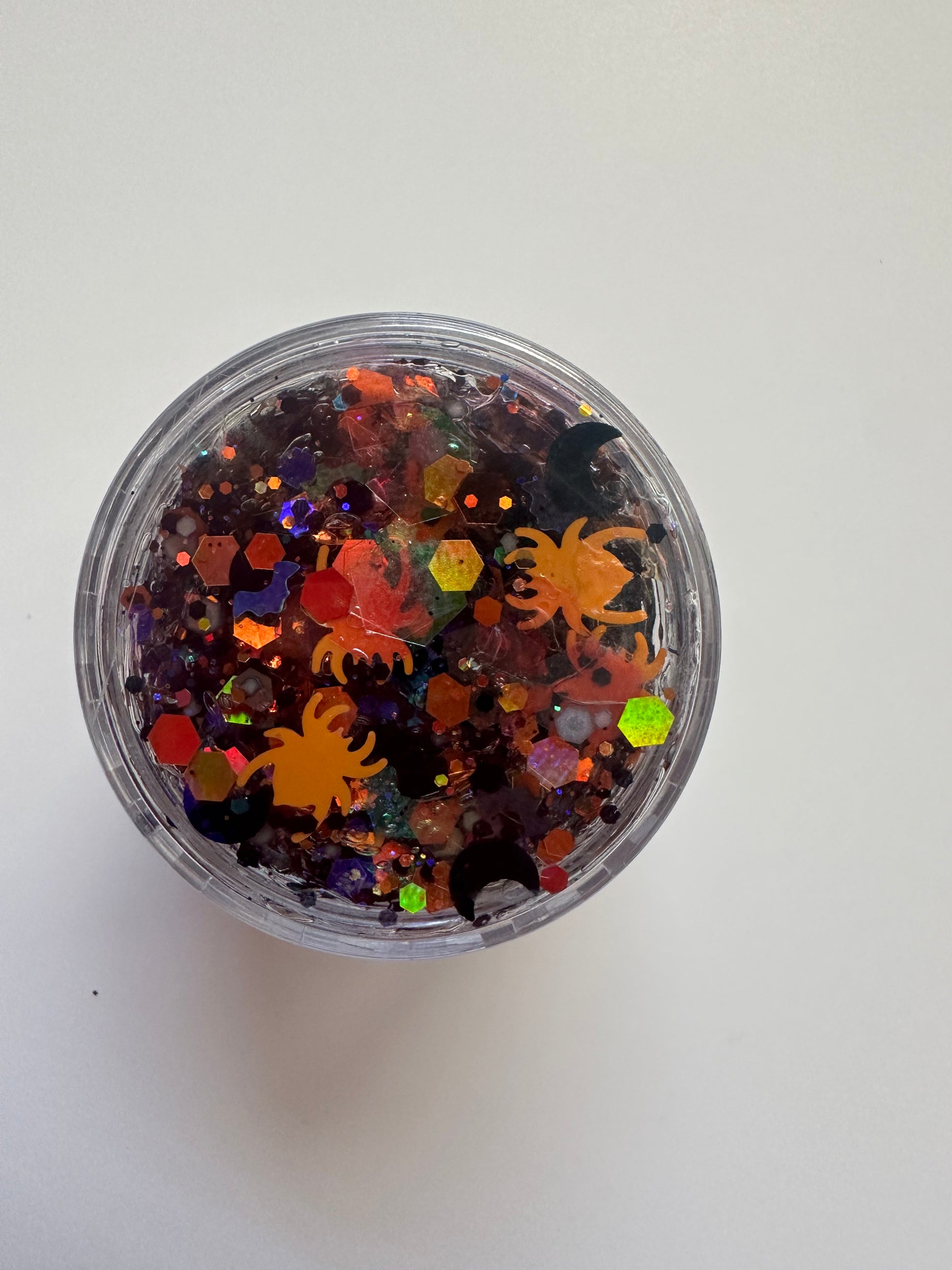 Fright Night- Black, oranges, Chunky irridescent, orange spiders